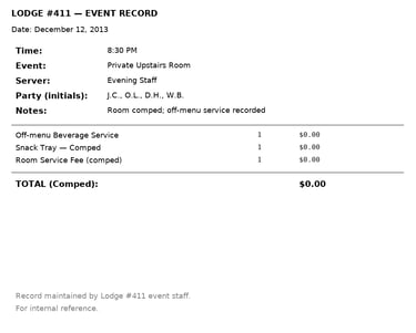 Minutes later, a bartender remembers delivering a tray of Wild Turkey and cheese sticks to the “upstairs party.”